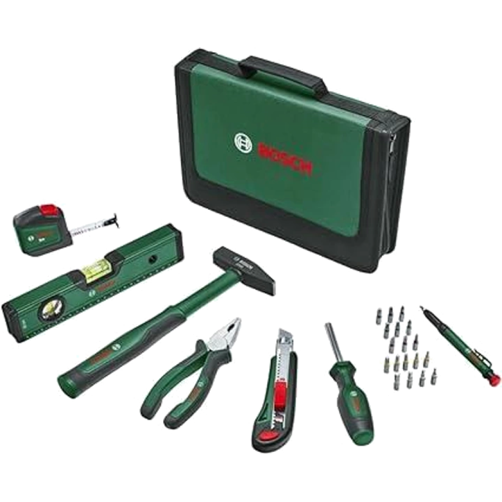 ● До набору інструментів Bosch входять комбіновані плоскогубці, універсальна викрутка, молоток 300 г, висувний ніж, рулетка 3 м, спиртовий рівень 25 см, маркер глибоких отворів, 18 біт: PH1/2/3, PZ1/2/3, SL4/5/6, Torx10/15/20/25/30, HEX3/4/5/5/6;● Йдуть у м'якому пеналі з нетканого матеріалу, в якому для кожного інструменту передбачено окреме місце;● Призначається для використання в побуті, дасть змогу вирішити різноманітні завдання з ремонту, технічного обслуговування та оздоблення;● Високоякісні матеріали виготовлення і точність обробки для тривалої роботи;● Відмінна ергономіка для оптимального контролю та комфорту