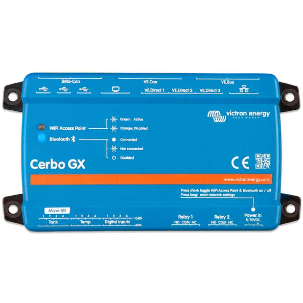 ● Порти VE.Direct (завжди ізольовані) 3 (макс. можливі пристрої VE.Direct: 15);● VE.Bus (завжди ізольований) 2 паралельних розетки RJ45;● VE.Can, порт BMS-Can, Bluetooth, роз’єм Ethernet 10/100 RJ45, WiFi, 2 порти USB Host і 1 порт лише живлення