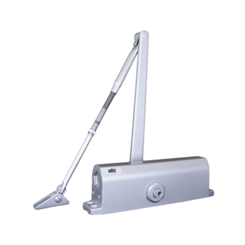 Доводчик дверний, срібний. ATIS DC-5036 BC, дві незалежно регульовані швидкості Зусилля закриття: вага дверей від 60кг до 120кг, ширина дверей від 950мм до 1400мм, матеріал корпусу: алюмінієвий сплав, виконання тяги: важільна, тип штанги: коленная, напрацювання на відмову: 1000000 циклів, робоча температура: від -30 ° C до + 50 ° C
