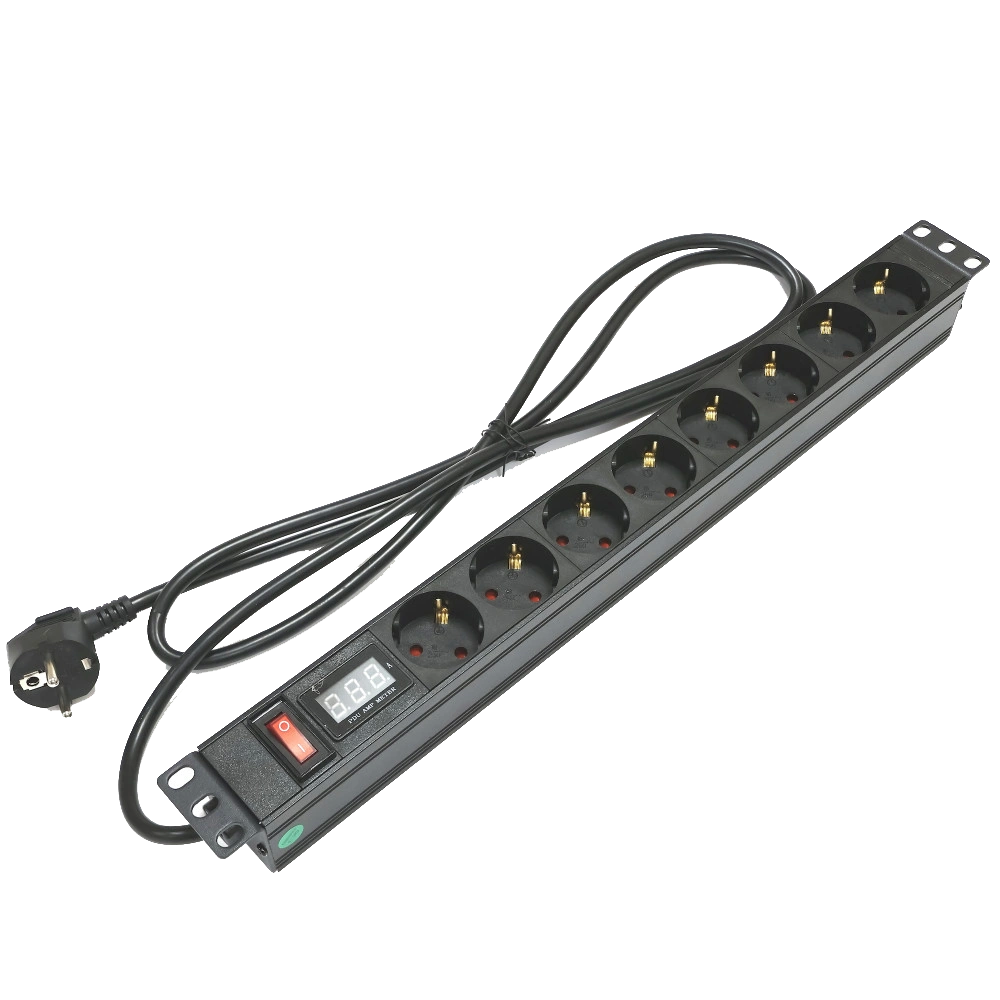 Силовий блок (PDU) призначений як для горизонтальної установки живлення обладнання в 19″ формат, так і вертикально, при розвороті кріплення на 180 градусів. Електричні характеристики: напруга 220-250В, сила струму 16А, частота 50-60Гц. Блок має металевий корпус, у якому розміщені гнізда під вилку стандарту CEE 7/7 (Schuko). На лицьовій панелі розміщена кнопка увімкнення/вимкнення та цифровий дисплей амперметра.