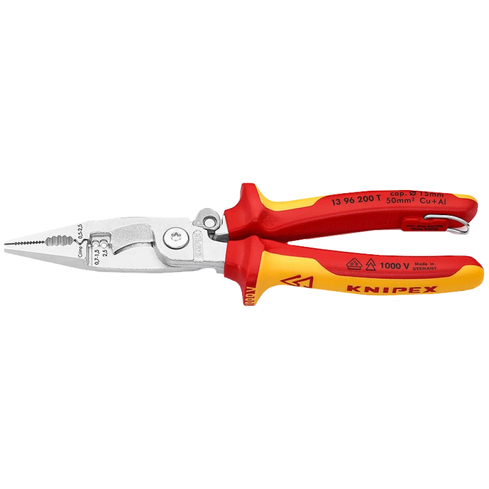 ● З пружиною закриття засувки призводить до змикання лез, але не блокує інші функції;● Отвори для видалення ізоляції з проводів 0,75 – 1,5 мм ² і 2,5 мм²;● Обпресувальний гніздо для контактних гільз 0,5 – 2,5 мм²;● Ножиці з прецизійними лезами (індуктивної гарту) для різання мідного і алюмінієвого кабелю до 5 x 2,5 мм² / 15 мм;● Параметри режиму різання: мідний кабель, багатопроводним 50 мм²