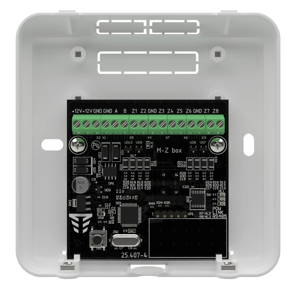 Напруга живлення: 10,8 – 13,8 В (входи +12V, GND); Струм споживання: 60 мА; Кількість шлейфів сигналізації: 8; Габаритні розміри: 90х70х30 мм; Маса: 0,12 кг