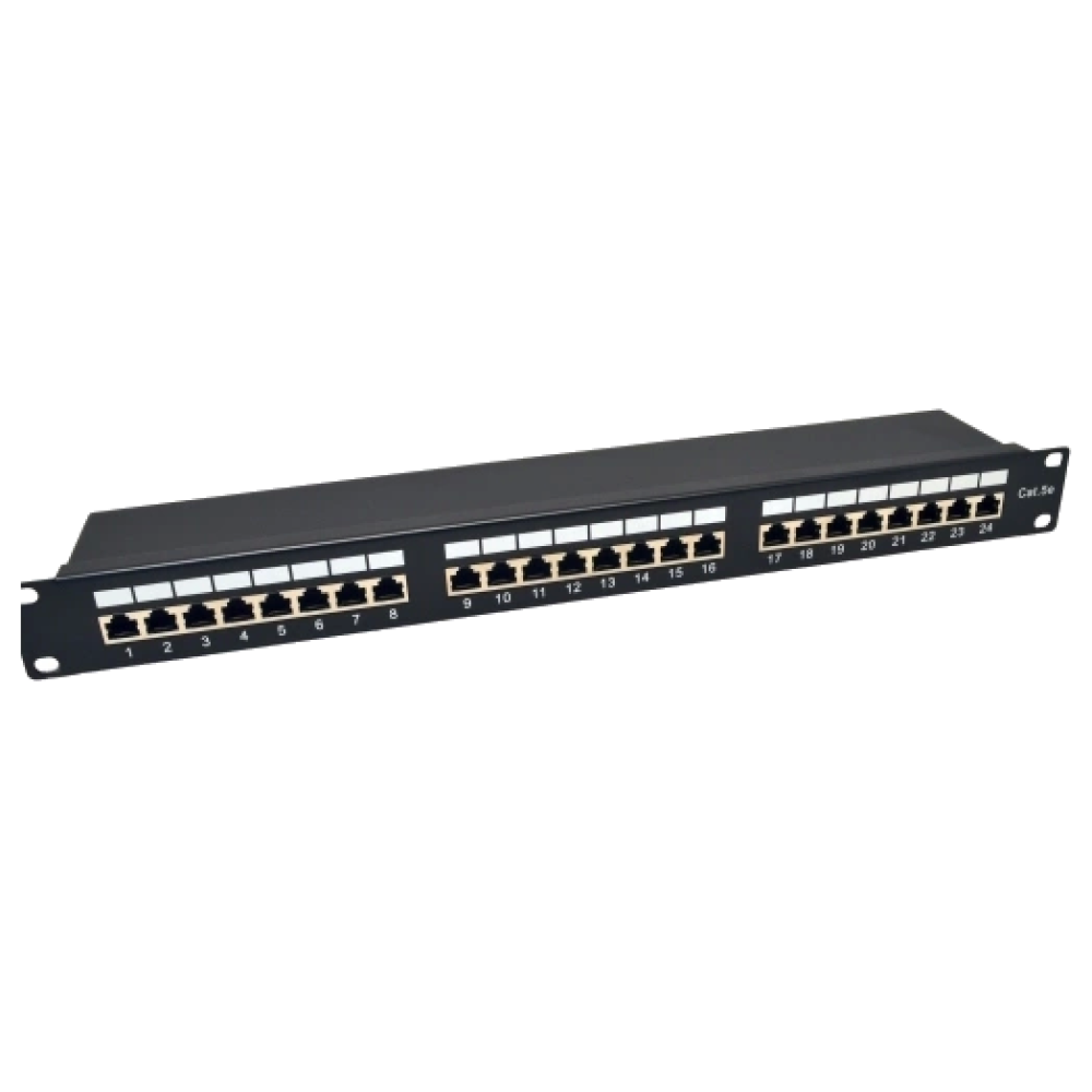 Патч-панель категорії 5е має 24 роз'єми RJ-45. Призначена для комутації між пасивним та активним обладнанням, комп'ютерами, є відмінним рішенням для упорядкування слаботочних систем.