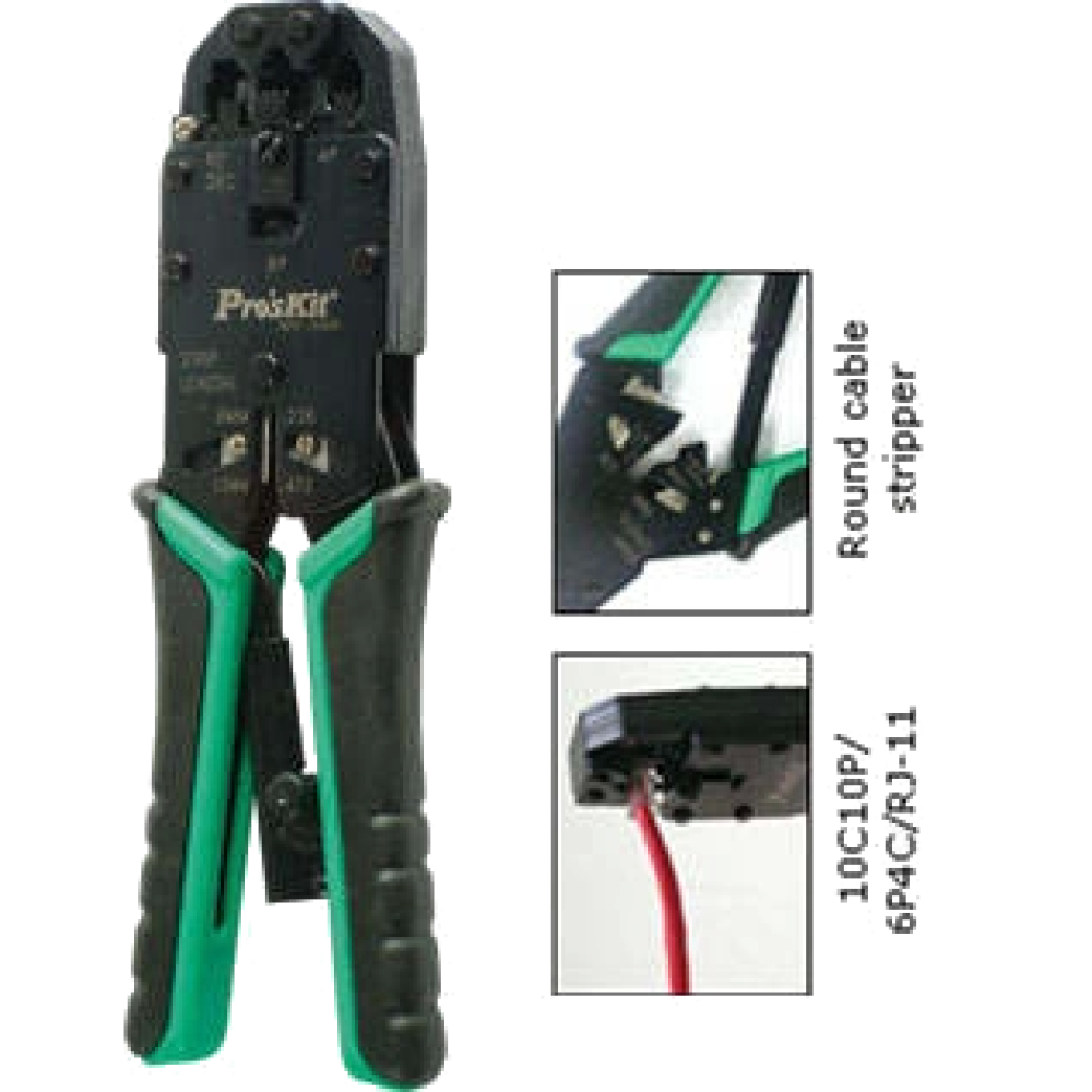 Професійний модульний кримпер, призначений для обжима конекторів 10p/10c, AMP 8P8C/RJ45; 6P6C RJ12; 6P4C RJ11; 4P2C/4P4C RL22. Паралельний обжим всіх жил кабеля. Виготовлені з вуглецевої сталі S45C. Змінні леза Pro'sKit 5PK-376K-Blade (6 шт/уп) в комплект не входять.