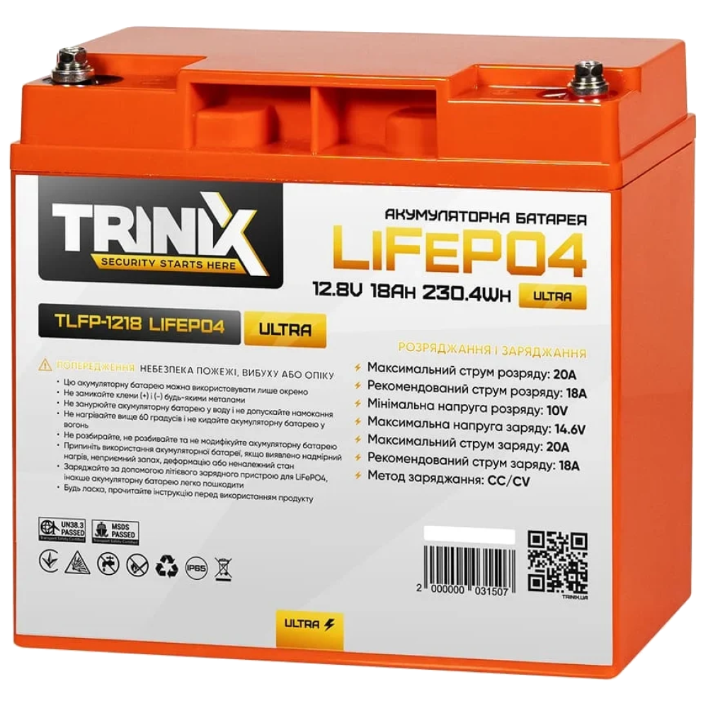 ● Тип акумулятора: LiFePo4 – літій-залізо-фосфат;● Вихідна напруга: 12,8 В;● Місткість: 18 А●г;● Максимальний струм заряду/розряду: 18 А;● Розміри: 181 х 78 х 164 мм;● Вага: 2.3 кг