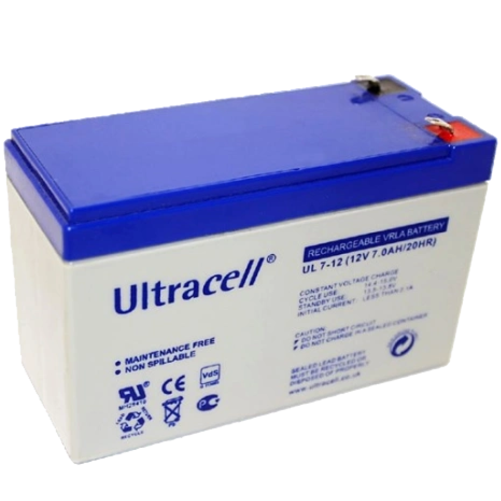 ● Тип клем – F2/F1;● Тип батареї – AGM;● Напруга – 12 В;● Місткість – 7 A•год;● Розміри – 151 x 65 x 93 мм;● Вага – 2 кг